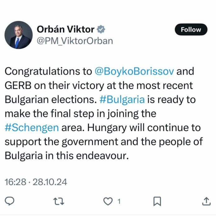 Унгарският премиер Виктор Орбан поздрави Бойко Борисов и ГЕРБ за победата на изборите. Орбан стори това в социалната мреха Х. Ето какво написа той: