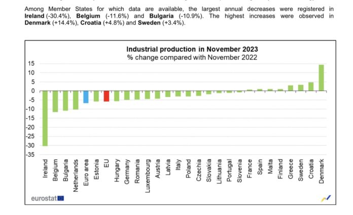 България е на 3 място в Европа по НАЙ-ГОЛЯМ СПАД на индустриалното производство, за ноември 2023 спрямо ноември 2022 година.