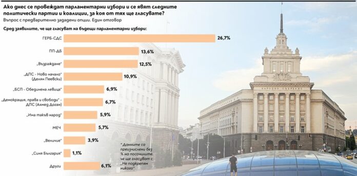 На второ място се нарежда ПП-ДБ с 13,6%, следвани от “Възраждане” с 12,5%.