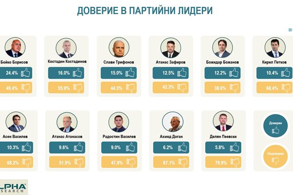 С най-голямо доверие сред лидерите на политическите партии е Бойко Борисов – с 24,4%. Следва лидерът на „Възраждане“ Костадин Костадинов с 16,0% и лидерът на ИТН Слави Трифонов с 15,0%.