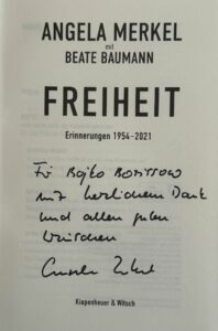 Ангела Меркел подари копие от книгата си на Бойко Борисов. Книгата е с написано лично посвещение от бившата германска канцлерка за лидера на ГЕРБ.