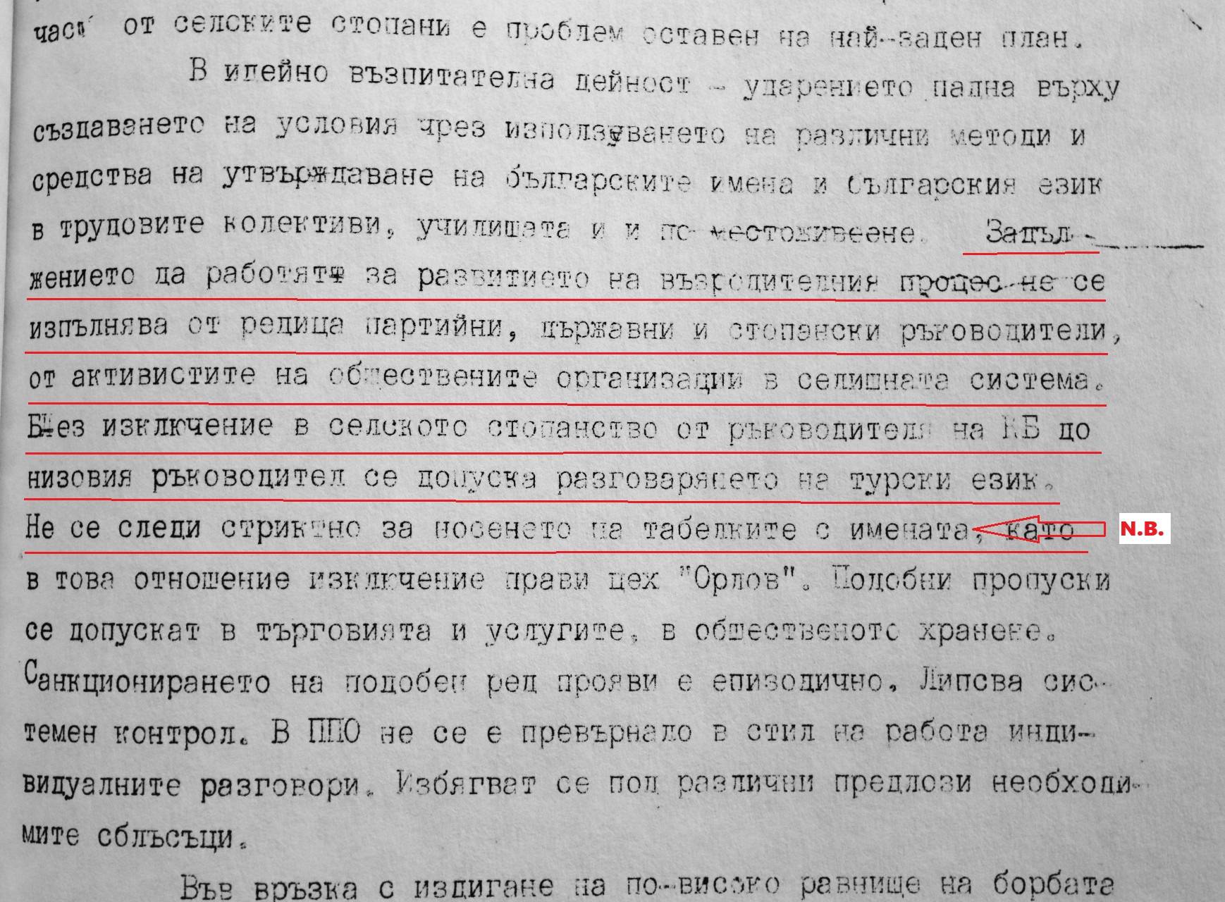 „Не задоволяват темповете на утвърждаване на единна езикова среда и българското социалистическо съзнание у гражданите с възстановени имена“.