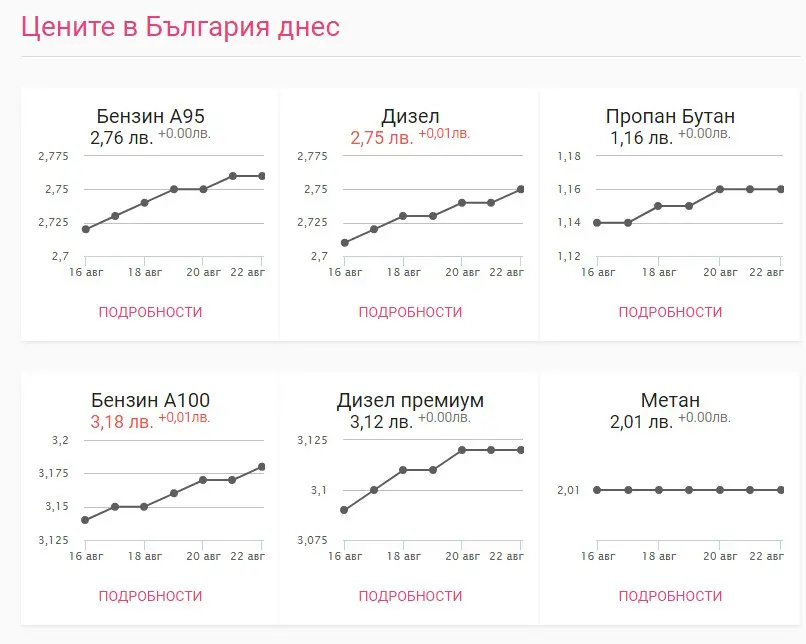 На 1 юли т.г. цената за литър бензин А95 варираше от 2,61 лв. до 2,65 лв. За литър дизел цената достигаше от 2,49 лв. до 2,67 лв. Месец и половина по-късно разликите са чувствителни. По големите столични бензиностанции цената за литър бензин А95 варира от 2,74 до 2,83 лв. А най-евтината цена за литър обикновен дизел е 2,71 лв., най-скъпата – 2,83 лв.