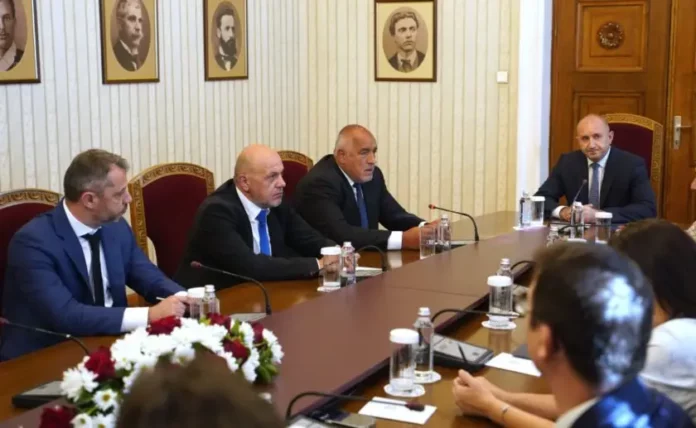 Лидерът на ГЕРБ Бойко Борисов, придружен от Томислав Дончев и Делян Добрев, се появи точно в 9.00 ч на консултациите при президента Румен Радев.
