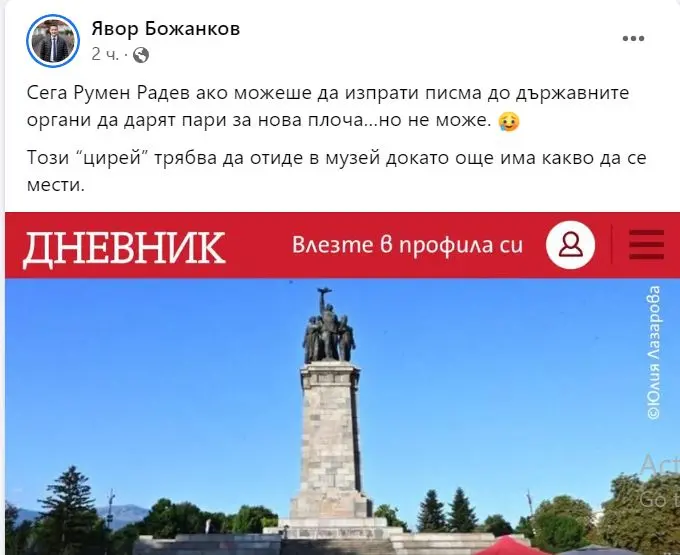 „Сега Румен Радев, ако можеше да изпрати писма до държавните органи да дарят пари за нова плоча…но не може. Този „цирей“ трябва да отиде в музей, докато още има какво да се мести, написа Божанков.