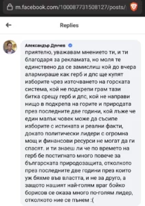 Приятелю, уважавам мнението ти, и ти благодаря за рекламата, но моля те единствено да се замислиш кой до вчера алармираше как ГЕРБ и ДПС ще купят изборите чрез източването на горската система, кой не подкрепи грам тази битка срещу ГЕРБ и ДПС, кой не направи нищо в подкрепа на горите и природата през последните две години, кой лъже че един малък човек може да съсипе изборите с истината и реални факти, докато политически лидери с огромна мощ и финансови ресурси не могат да ги спасят. и ти знаеш ли че по времето на ГЕРБ бе постигнато много повече за българската природозащита, отколкото през последните две години през които уж бяхме във властта, и не за друго, а защото нашият най-голям враг Бойко Борисов се оказа много по-голям лидер, отколкото ние се пънем.