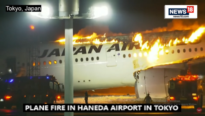 На кадрите, разпространени от националната японска телевизия NHK, се виждат пламъци, които излизат от прозорците и двигателите на пътническия самолет, който е изгорял до основи. Всички пасажери са евакуирани навреме, посочват японски медии.