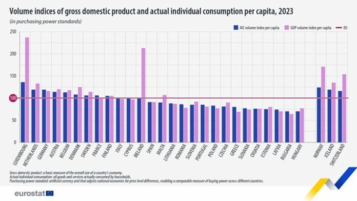 Съществени са и разликите между страните от Евросъюза през 2023 г. по отношение на брутния им вътрешен продукт (БВП) на човек от населението, изразен чрез стандарта на покупателна способност (СПС).