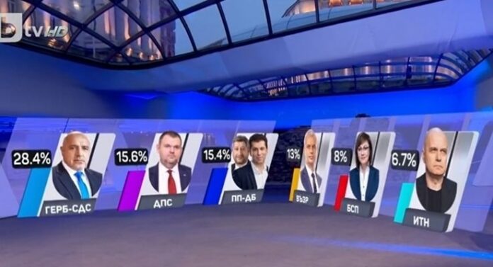 ГЕРБ-СДС печели парламентарния вот с 28,4 %, а втори са ДПС, които вземат 15,6%. Това сочат финалните данни от екзитполовете на агенция „Маркет линкс“, излъчен по bTV.