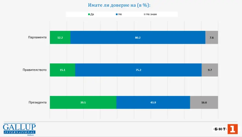 Сред трите основни институции на политическото представителство и власт у нас с най-високо одобрение е президентската: с 39,5% доверие, при 43,9% недоверие. Доверието в правителството е 15,1%, а недоверието – 75,2%, а парламентът е с 12,2% доверие, при 80,2% недоверие.