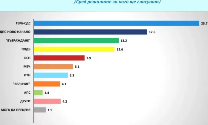 ДПС–Ново начало заема втора позиция – 17,6%. Това ниво на подкрепа е съпоставимо с резултата от изборите преди година, през юни 2024 г. (17,06%), непосредствено преди вътрешнопартийния конфликт. В съчетание с фактическия разпад на АПС (сега с едва 1,4% подкрепа), този резултат е индикация, че традиционният електорат на формацията се консолидира около легитимния политически субект – ДПС-Ново начало. Предвид характерната висока мобилизация на тази електорална група в изборна обстановка, хипотезата е, че подкрепата за ДПС–Ново начало може да се увеличи в реална изборна ситуация.