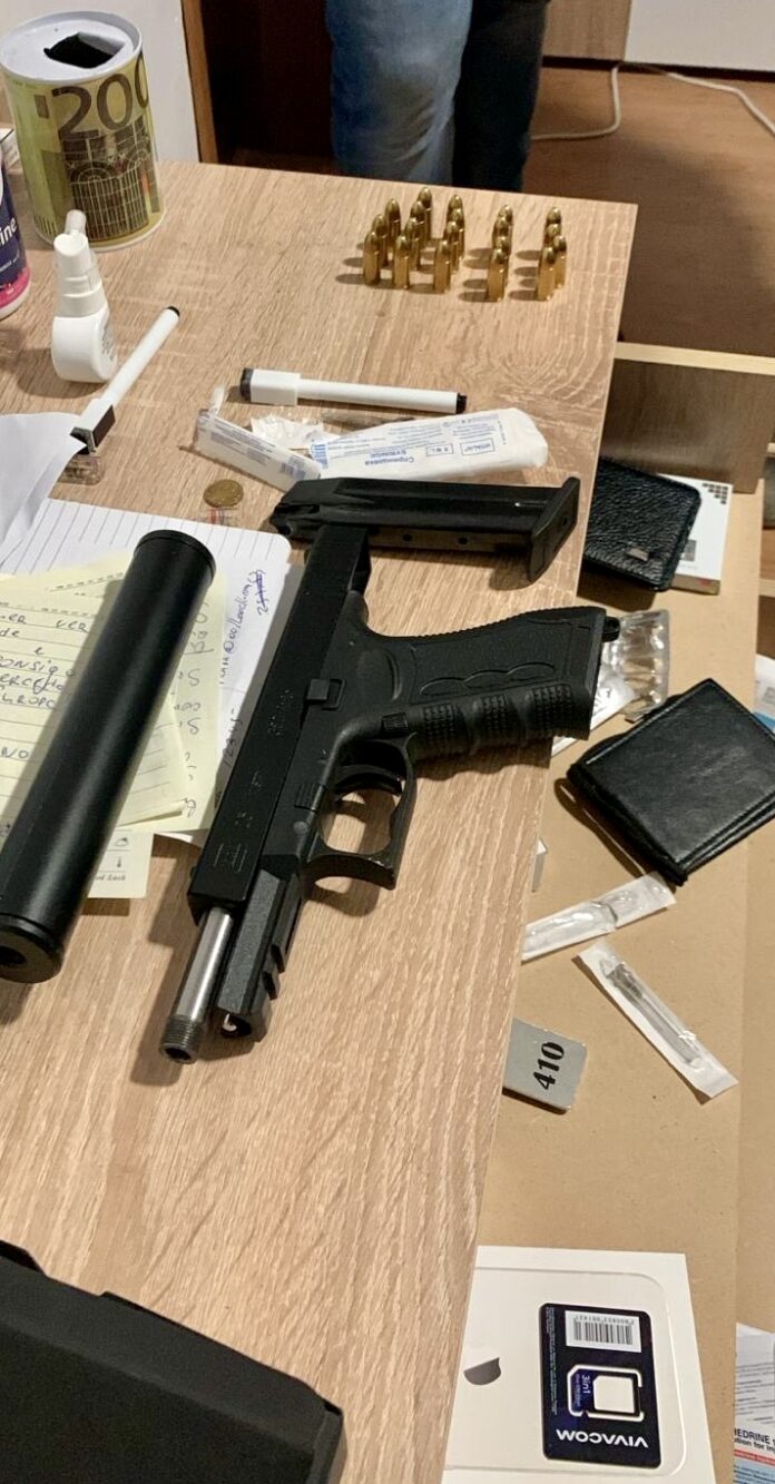 Операцията е проведена като част от международно разследване. В хода на проведените действия у нас въз основа на европейска заповед за разследване, са претърсени 3 адреса и 2 моторни превозни средства, свързани със задържания. На един от адресите, обитаван от него, е иззет преправен боен пистолет със заличени номера и заглушител, 2 пълнителя и 19 патрона за оръжието. Открити са и документи и записки, които имат отношение към разследването. Иззети са и два мобилни телефона. На другите два адреса, собственост на свързано със задържания лице, са открити още 7 огнестрелни оръжия (5 пистолета и 2 пушки), както и 1000 боеприпаса.