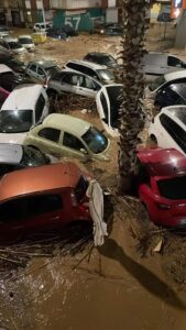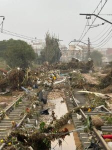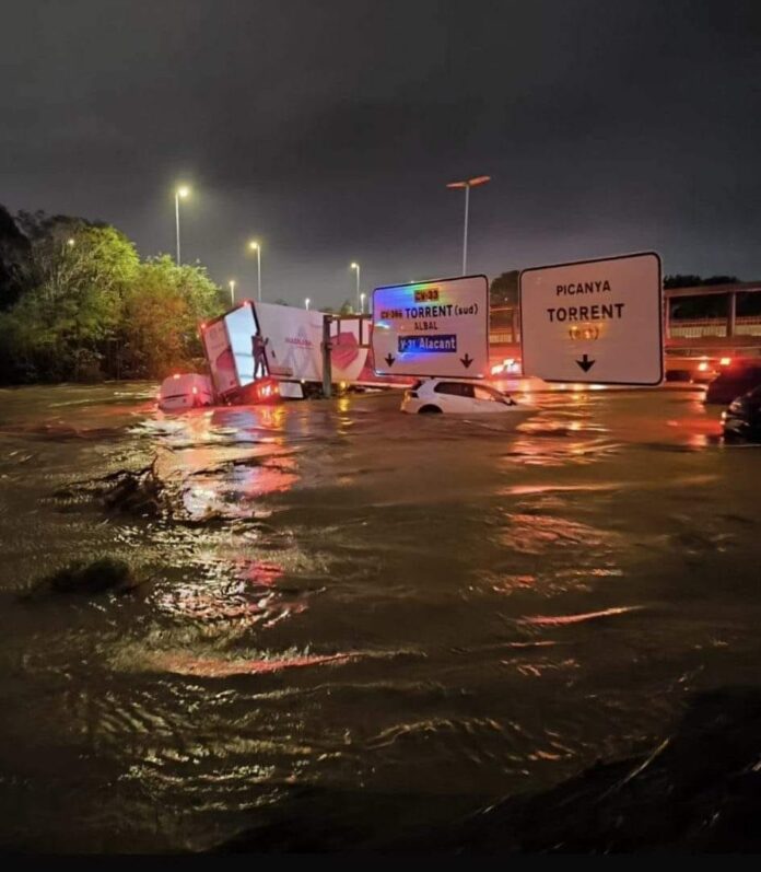 Кадри на бедствието, заснети от службите за спешна помощ от хеликоптер, показва срутени мостове, преобърнати коли и камиони, натрупани един върху друг по магистрали между наводнени полета извън Валенсия. Влаковете до Мадрид и Барселона бяха отменени поради наводненията, а училищата и други основни услуги бяха спрени в най-засегнатите райони, казаха служители.