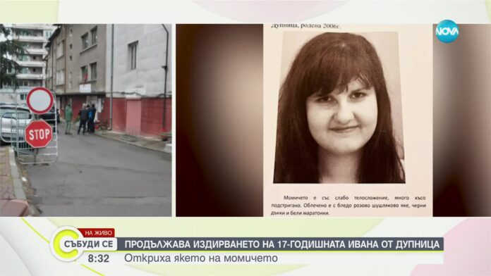 Сигналът за изчезването на Ивана от Дупница е получен късно в петък вечер. Тийнейджърката е в неизвестност от четвъртък. В събота, преди тунела на главния път Е-79, беше открито якето, което Ивана носела, когато е видяна за последно. В акцията по издирването се включиха над 150 полицаи и жандармеристи, доброволци и следови кучета.