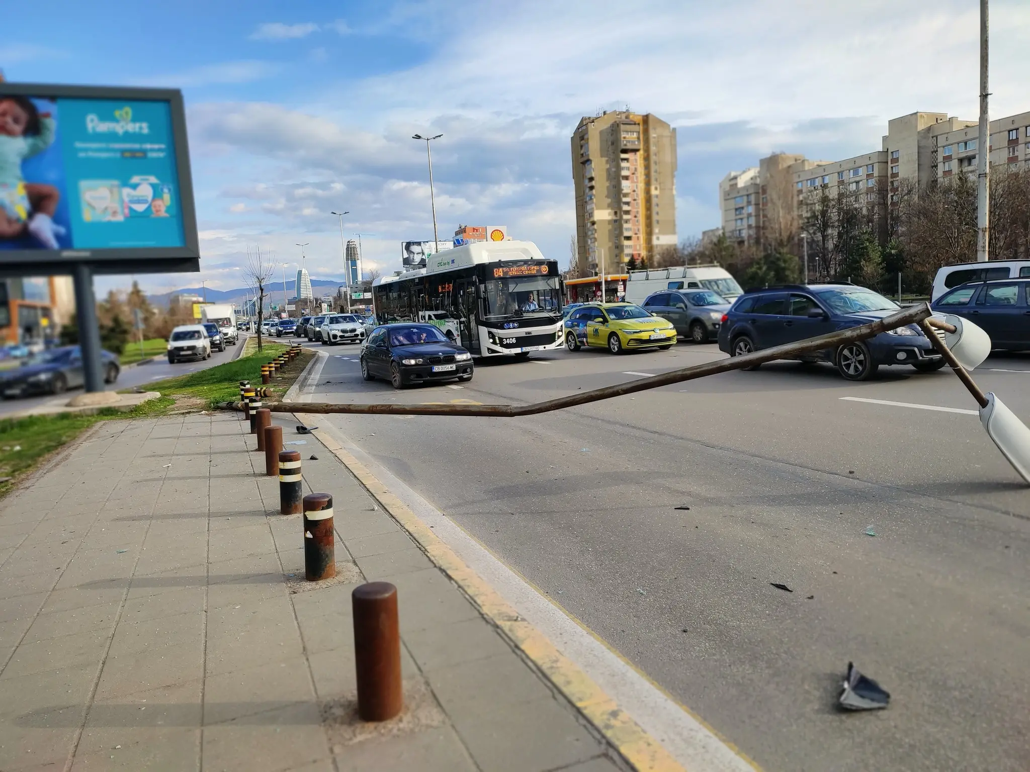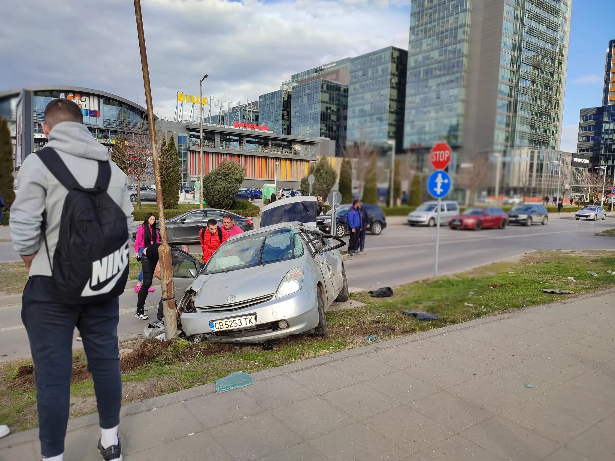 Кола се заби в стълб близо до автобусна спирка на булевард „Цариградско шосе“ в София, до The Mall. Това става ясно от публикация във фейсбук групата „Катастрофи в София“