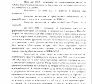 „1. “През март 2022г. министърът на здравеопазването (Асена Сербезова) указва на ИАЛ да бъде извършена промяна на формулата за изчисляване на недостига в съответствие със ЗЛПХМ.”