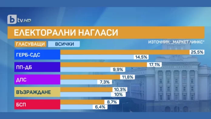 Над 8 процента разлика между ГЕРБ-СДС и ПП-ДБ на предстоящите предсрочни парламентарни избори. Това показва национално проучване, финансирано и реализирано съвместно от bTV и „Маркет ЛИНКС“, проведено сред 1046 души над 18 г. между 30 март и 7 април чрез пряко лично интервю и онлайн анкета.