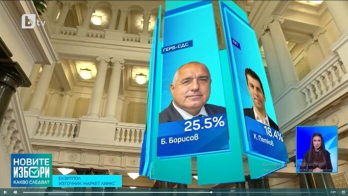 ГЕРБ-СДС печели изборите с 25.5% от гласовете, сочат данните от екзит половете на агенция „Маркет линкс“ в края на изборния ден, цитирани от БТВ.