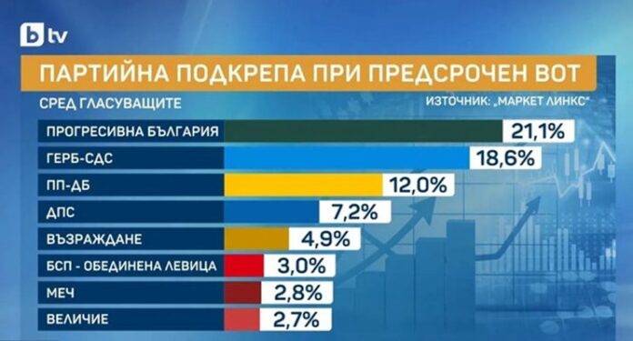 Коалицията на доскорошния президент Румен Радев „Прогресивна България“ би спечелила 21,1% от гласовете, ако изборите бяха днес, а ГЕРБ-СДС – 18,6%. Това сочи ново проучване на социологическата агенция „Маркет линкс“, проведено между 7 и 15 март по метода пряко лично интервю и онлайн анкета сред 1006 пълнолетни българи, финансирано съвместно от Би Ти Ви и социологическата агенция.