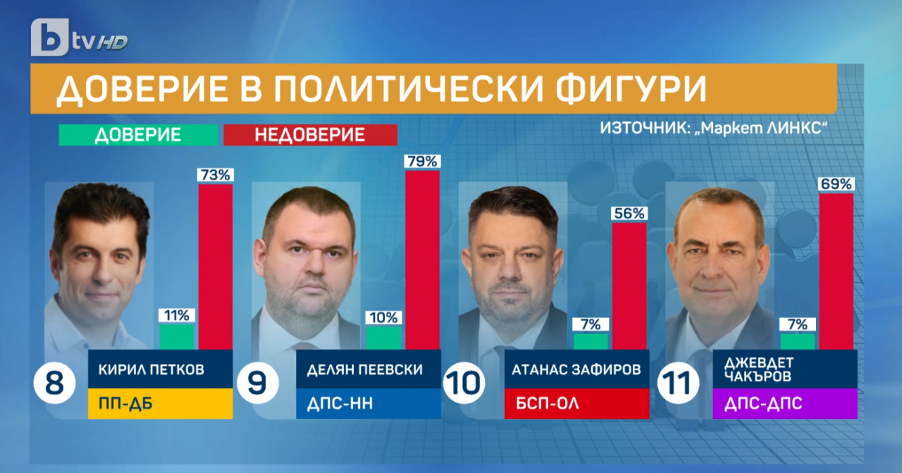 „Делян Пеевски вдига доверието си с 2% (при 8% в предишното проучване), което може да се дължи на ежедневното му говорене в публичното пространство.“