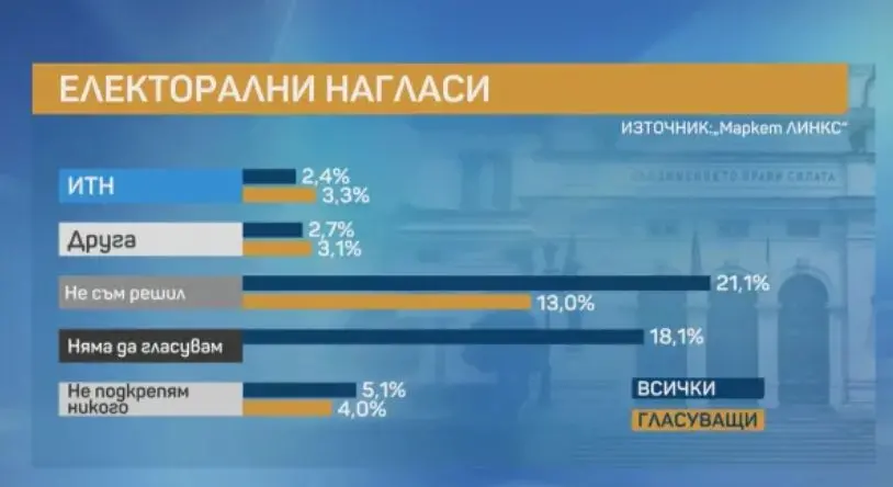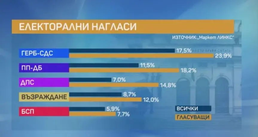 Последно проучване на социологическа агенция Маркет Линкс сочи, че при избори днес първа политическа сила е ГЕРБ-СДС с 23.9%, втори са ПП-ДБ с 18.2%, след тях се нареждат ДПС с 14.8%, четвърта сила е „Възраждане“ с 12%, пети са БСП с едва 7.7%. Извън чертата попада ИТН, които са с 3.3%. Доверието към правителството варира от 22 до 30%.