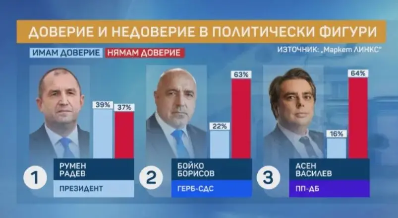 От политическите лидери единствен с висок рейтинг и доверие и Бойко Борисов, сочи проучването с 22%. След него се нарежда Асен Василев с 16%.