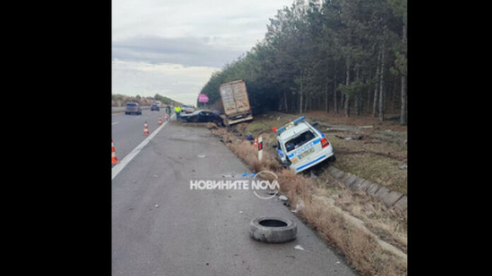 Вчера тир помете полицейска кола на магистралата, като в катастрофата участва и трети автомобил. Леко ранени бяха и двама полицаи.
