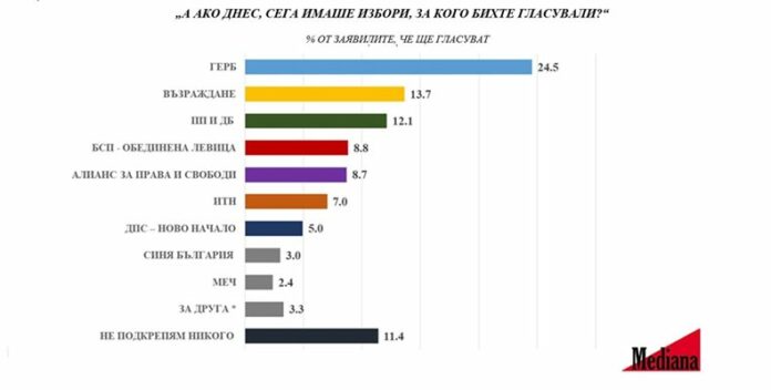 Първа политическа сила, ако изборите бяха днес, е ГЕРБ с 24,5%. Това сочи изследване на агенция „Медиана“, проведено в периода 8–13 октомври 2024 год. с 978 пълнолетни граждани чрез пряко стандартизирано интервю. Проучването е изследователски проект на агенцията и е реализирано със собствени средства.