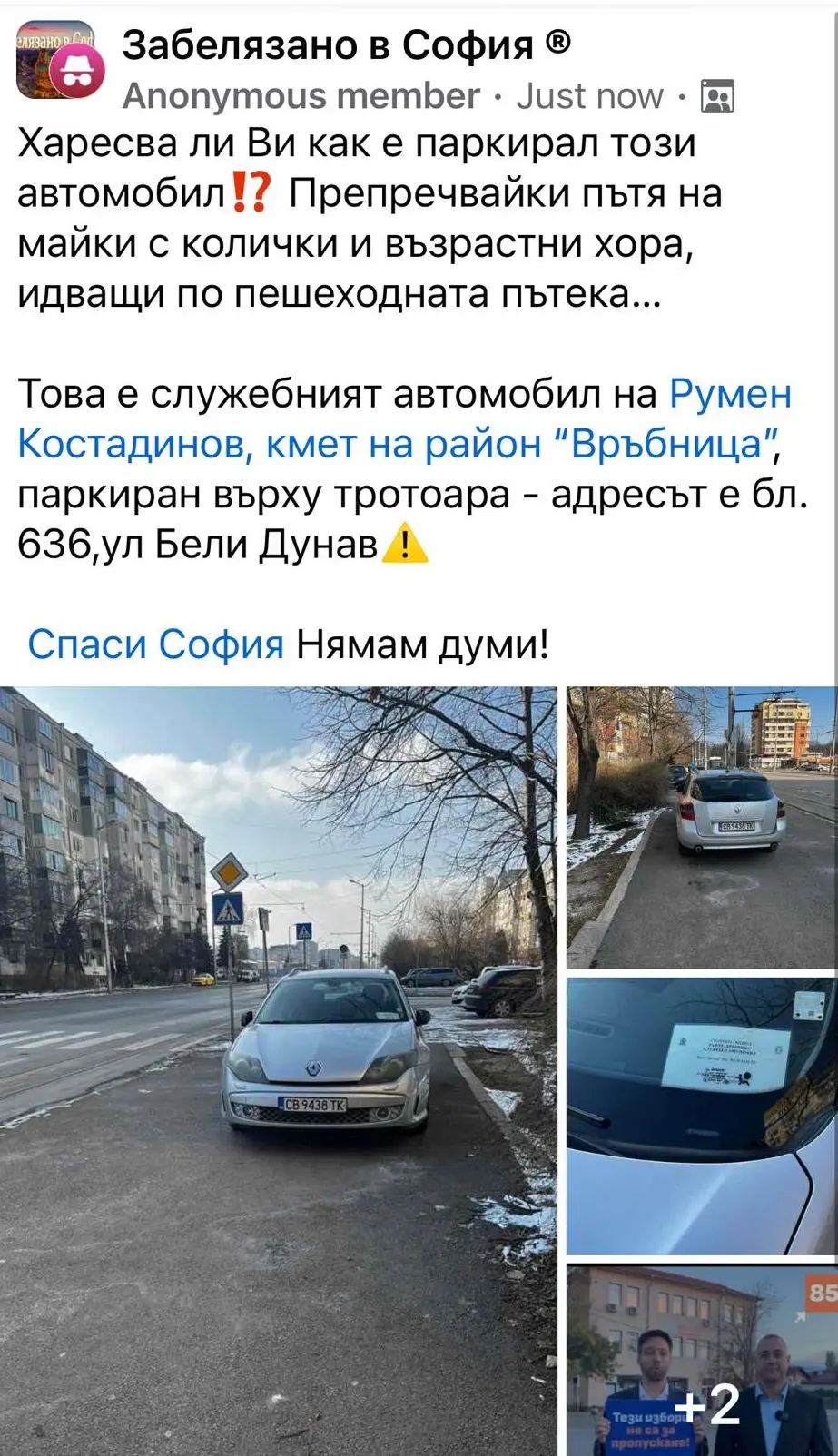 По всичко личи, че Костадинов от „Спаси София“ няма скрупули и не само е сложил стикер с логото на Столична община, но и е паркирал на тротоар. Възмутени граждани алармират за неправилното спиране във Фейсбук групата „Забелязано в София“. От там става ясно, че един от „спасителите“ на Борис Бонев не се интересува откъде ще минават майките с количките и пешеходците, важното е да му е удобно.