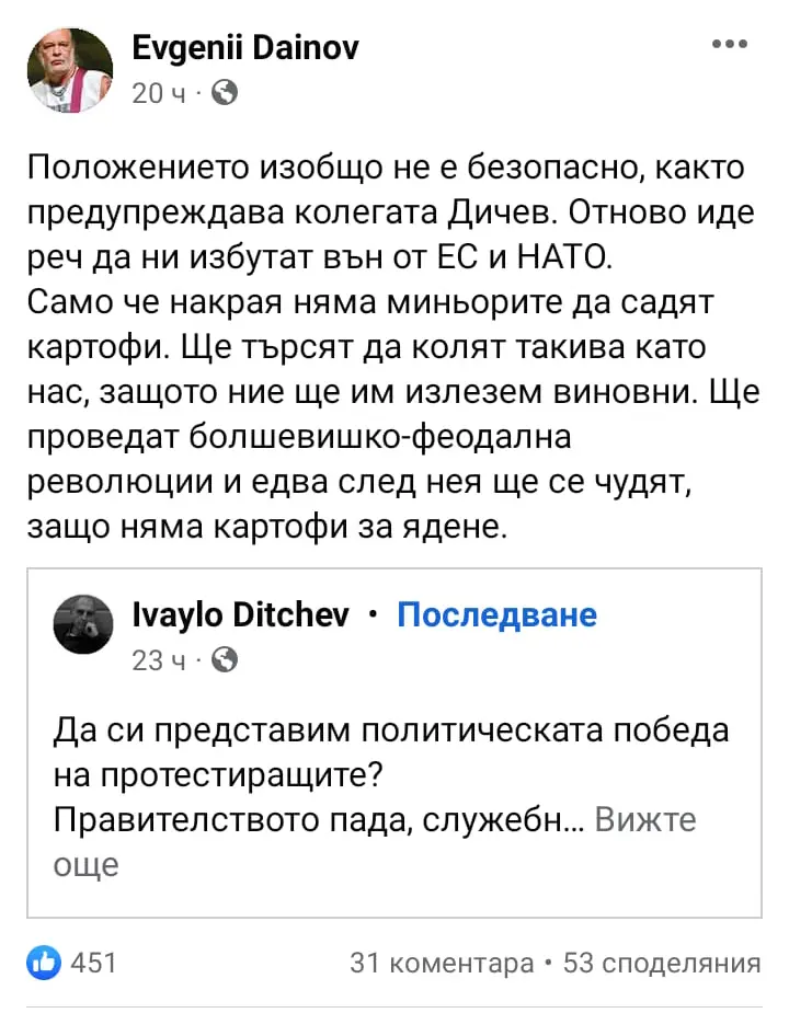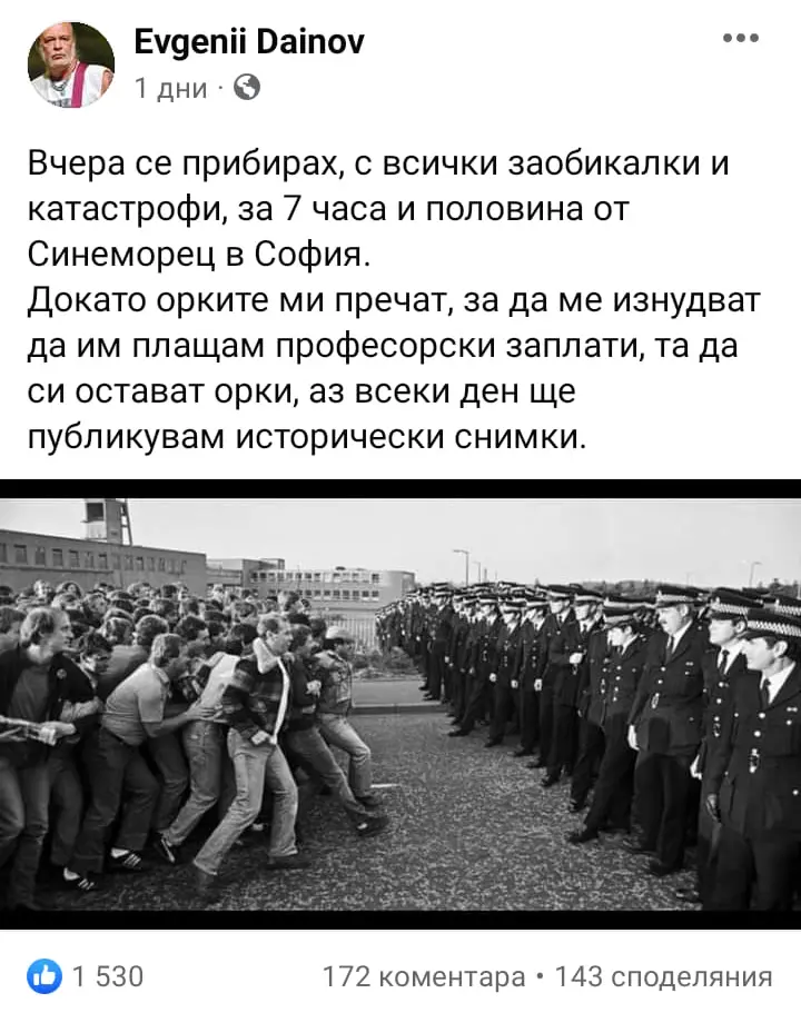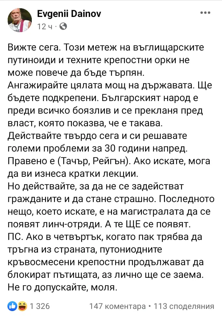 Политическият анализатор и професор в НБУ Евгений Дайнов с ясно изразена позиция срещу протестиращите миньори. Пореден ден той не спира да произвежда нови и нови публикации във фейсбук срещу посмелите да протестират срещу кабинета на „Продължаваме промяната“.
