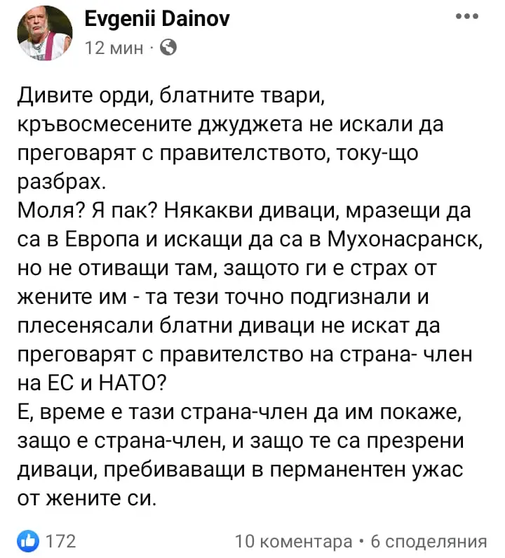 Впоследствие радикализацията на Дайнов ескалира и „робите“ в постовете му станаха „диви орки“, „блатни твари“, „кръвосмесени джуджета“ и „презрени диваци, пише Tribune.bg и публикува подборка от тези словесни бисери.