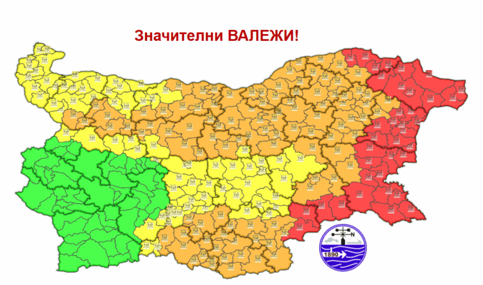 За вторник са обявени червен, оранжев и жълт код за опасно време. Най-голям риск има за Източна България, където предупреждението от най-висока степен е за интензивни валежи.