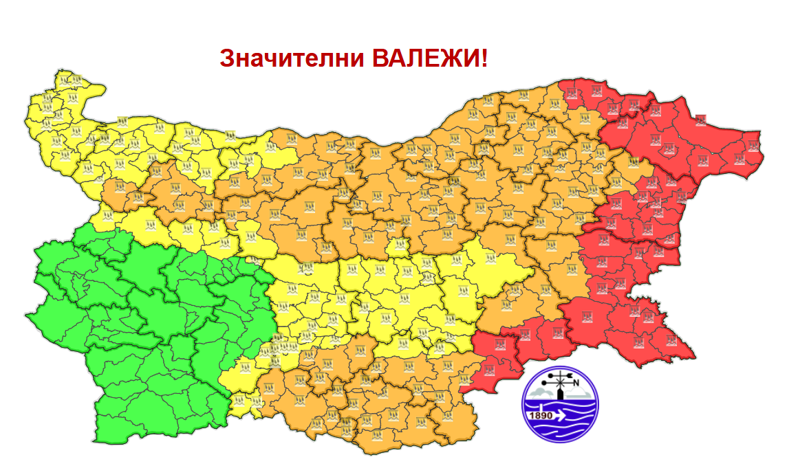 🟠 Предупреждение от втора степен – оранжев код – е обявено за част от областите Монтана, Враца, Плевен, Ловеч, Пловдив, Смолян, Хасково, Бургас, Варна и Силистра, както и за целите Кърджали, Габрово, Велико Търново, Русе, Търговище, Шумен.