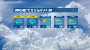 В неделя до обяд снеговалежите навсякъде ще спрат, над Западна България и облачността ще се разкъсва и ще намалява. Дневните температури там ще се повишат и в северозападните райони и западната част на Горнотракийската низина ще достигат до 8°-10°, на изток все още ще са между 2° и 7°.