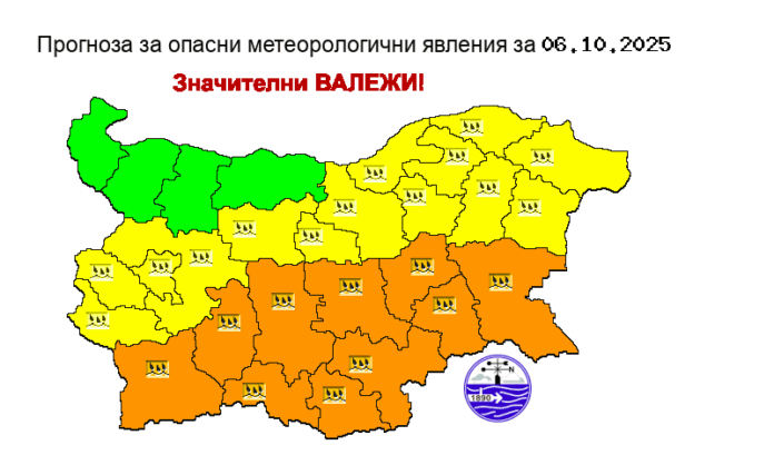 Предупреждение от първа степен – жълт код за интензивни валежи, е обявено за Централна и Североизточна България. Така обстановката ще бъде спокойна само в четири области на северозапад, а лошото време се очаква да продължи до сряда.