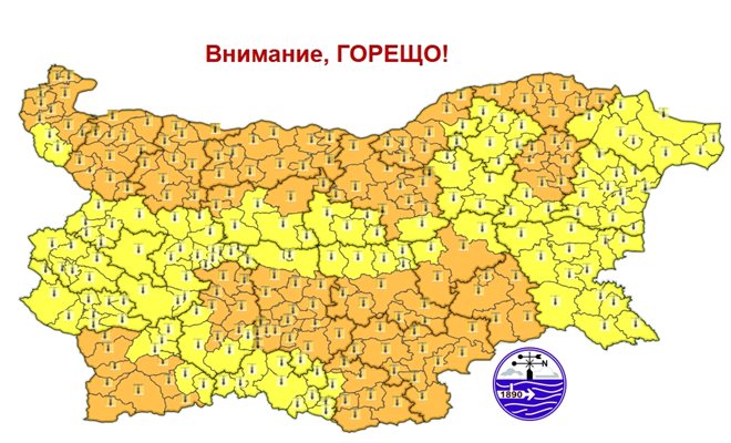 В 17 области за утре е обявено предупреждение от втора степен – код оранжев. Това са областите Видин, Монтана, Враца, Плевен, Ловеч, Търново, Русе, Силистра, Шумен, Сливен, Ямбол, Хасково, Кърджали, Стара Загора, Пловдив, Пазарджик и Благоевград.
