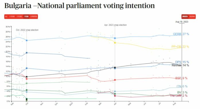 Партията на Костадин Костадинов „Възраждане“ в момента би спечелила отново около 14% от гласовете. Така тя става четвърта вместо трета политическа сила. Третото място заема ДПС. Те изпреварват „Възраждане“ с 1% и биха получили 15% от гласовете, ако изборите бяха днес. Това става ясно от секцията Poll of Polls на европейското издание на Шпрингер „Политико“. В нея изданието обобщава данни от всички налични социологически изследвания за месеца в съответната държава.