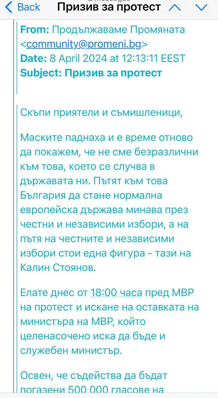 В мейла си от ПП пишат, че протестът трябва да е против вътрешния министър Калин Стоянов, защото според тях той имал участие в кражба на гласове и се съмняват в честността на вота, без да има каквито и да било доказателства за техните твърдения.