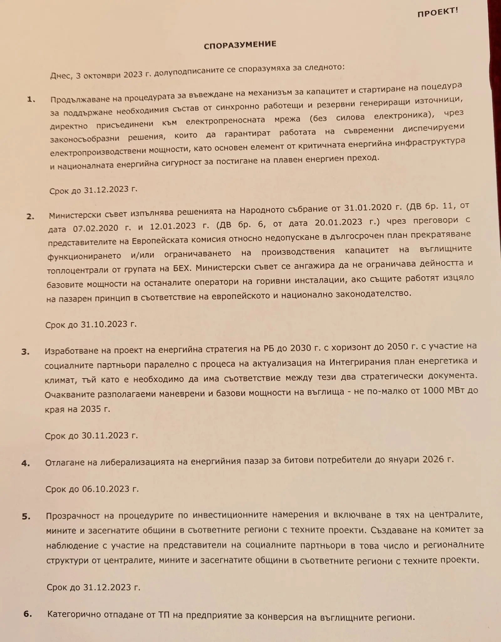 Министерството на енергетиката и депутати уточняват споразумението със синдикатите по исканията на протестиращите миньори и енергетици. По неофициална информация разговорите са преминали в работен формат и дори е оформен проект на общ документ в осем точки.