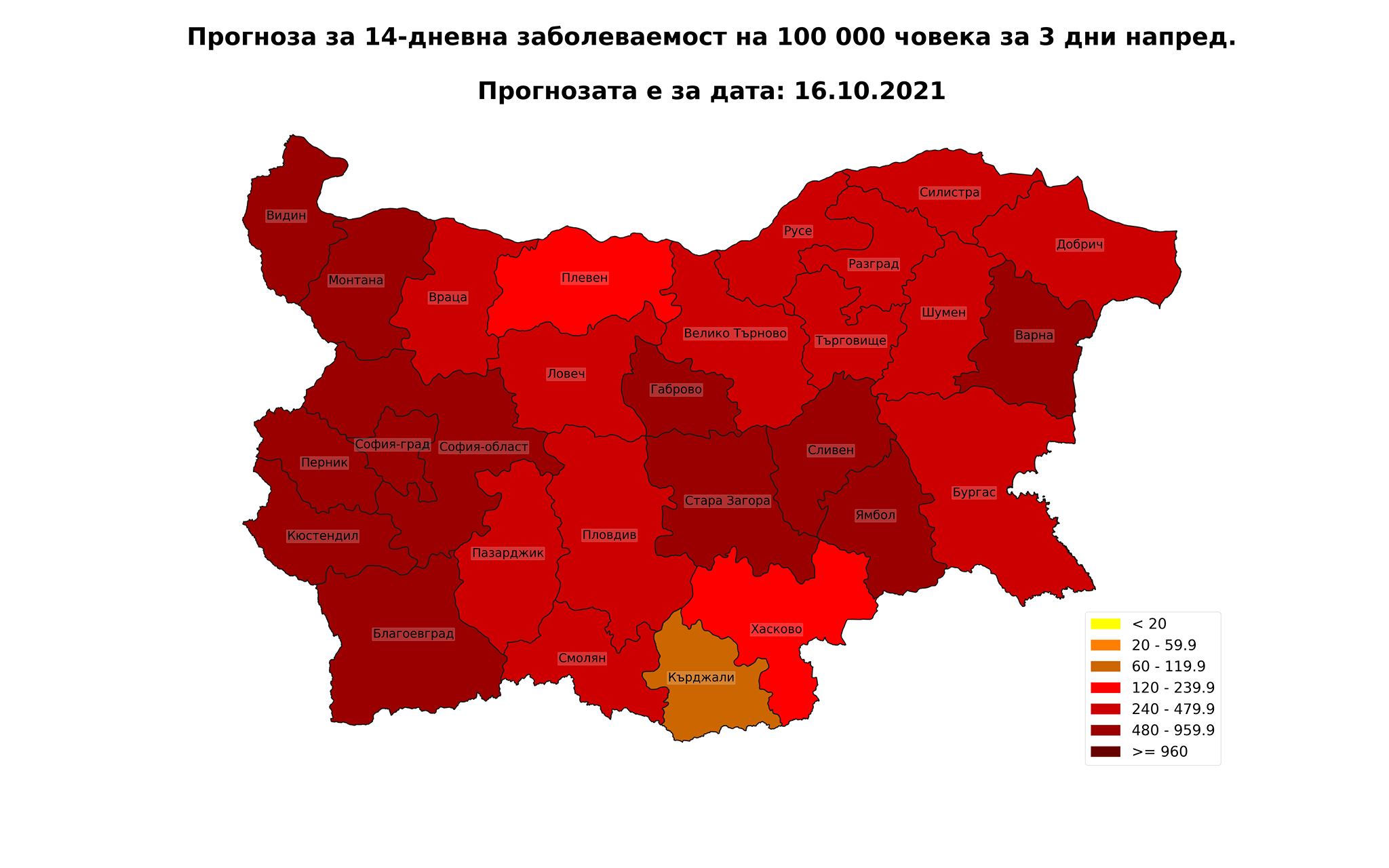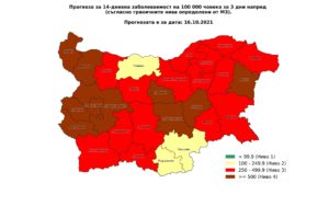 Прогнозната карта според данните на МЗ показва, че на 16 октомври в тъмночервено ще светят Видин, Монтана, София, София-област, Перник, Кюсдендил, Габрово, Сливен, Стара Загора и Варна. Последните две досега не бяха в червената зона.