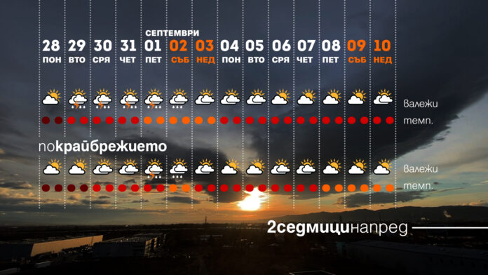 По крайбрежието предстоящата по-динамична обстановка ще обхване дните около началото на септември. Първите 2-3 дни на месеца ще преминат с краткотрайни валежи с гръмотевична активност. След това времето бързо ще се стабилизира и отново ще поеме по своя летен ритъм. Температурите до края на август ще се движат до 29-30 градуса, а от началото на септември ще се понижат леко до към 26-27 градуса.