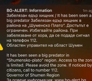 Системата „BG ALERT“ предупреди за забелязания едър хищник в района на „Шуменско Плато“. Известието гласи, че достъпът до района е ограничен и съветва хората да избягват района.