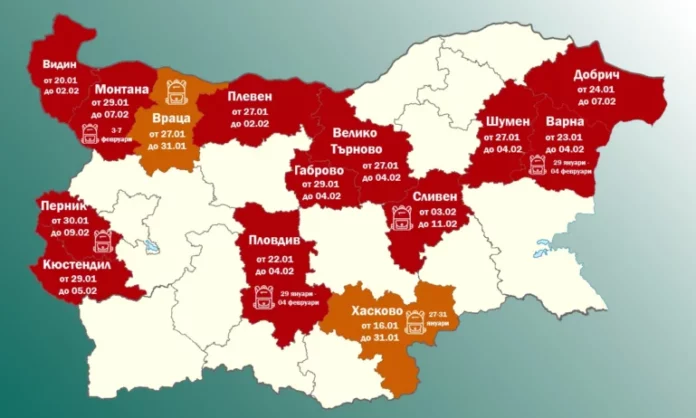 Учениците учат дистанционно и в областите Перник, Пловдив, Варна. Училищата са затворени също във Враца и Хасково до утре – 31 януари, когато ще бъде направена нова преценка дали въведените мерки ще бъдат удължени.