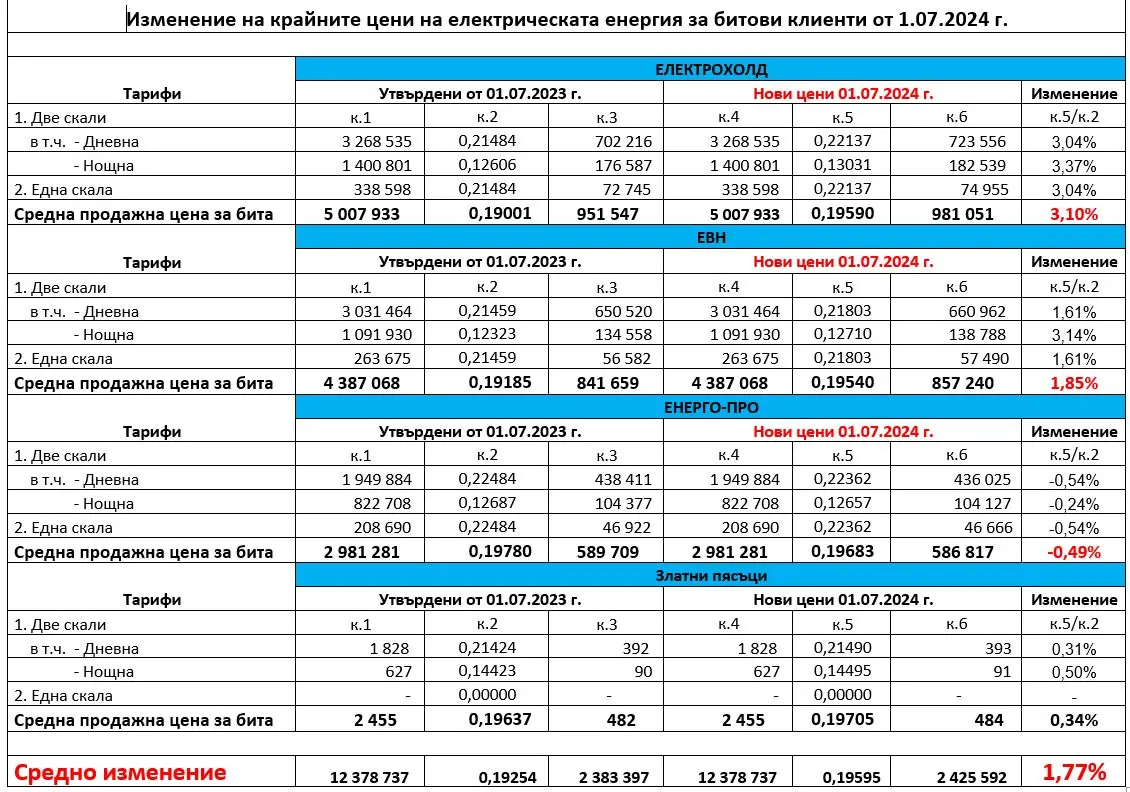 Комисията за енергийно и водно регулиране прие решение за цените в сектор „Електроенергетика“, които влизат в сила от 1 юли 2024 г. за следващия едногодишен ценови период до 30.06.2025 г. След отчитане на всички ценообразуващи елементи и прилагане на методиката за ценообразуване, Комисията утвърди средно увеличение на цената на електроенергията за битовите потребители с 1,77 %.
