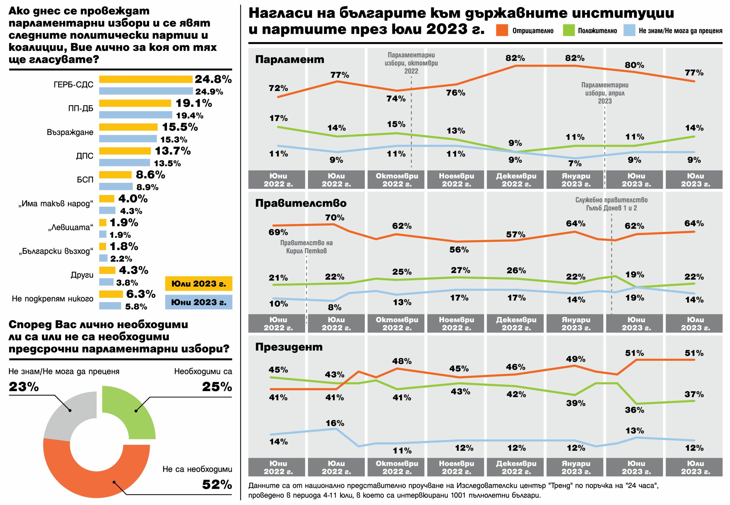 Тези са основните изводи от национално представително проучване на Изследователски център “Тренд” по поръчка на “24 часа”, проведено в периода. 4-11 юли 2023 г. ,в което са интервюирани 1001 пълнолетни българи.