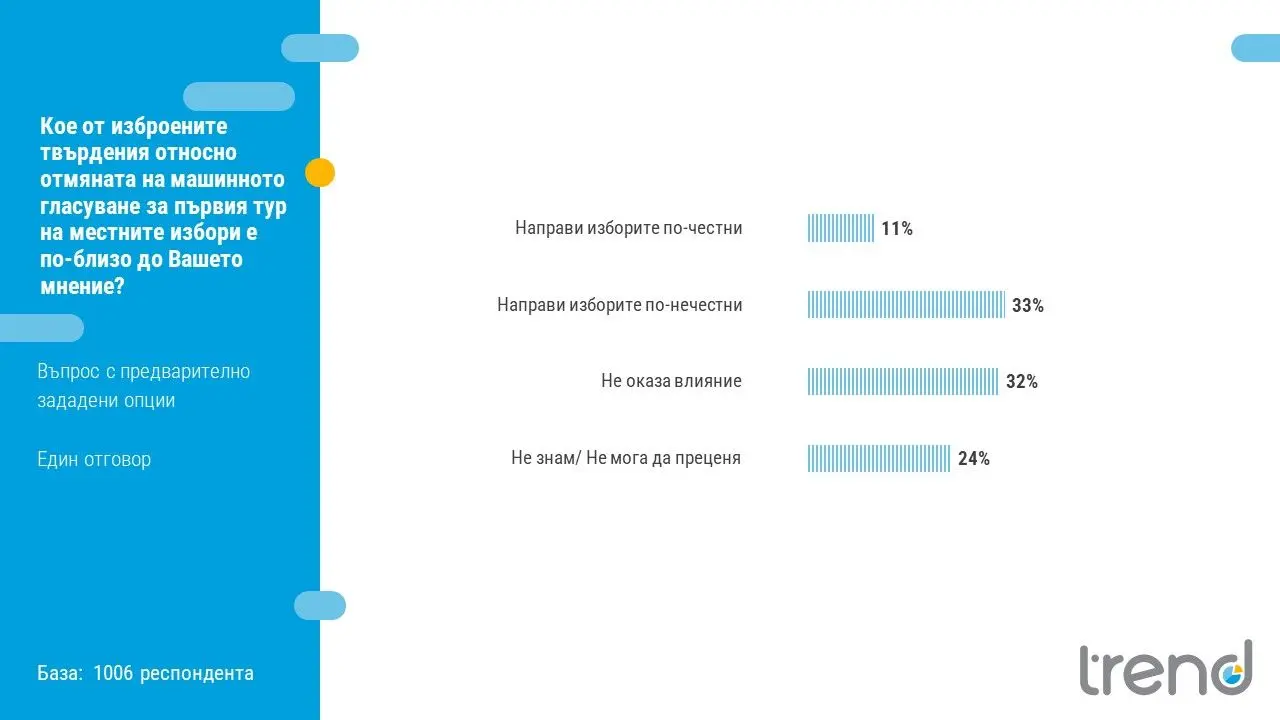 Една трета от българите са на мнение, че отмяната на машинното гласуване за първия тур на местните избори е направила изборите по-нечестни. Сходен дял (32%) смятат, че това не е оказало влияние върху честността на вота. Само 11% мислят, че това е направило изборите по-честни.