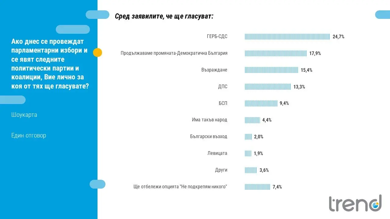 ГЕРБ остава първа политическа сила с подкрепа от 24.7% сред гласуващите, следвана от обединението „Продължаваме промяната-Демократична България“ (17.9%). „Възраждане“ запазва третата си позиция с подкрепа от 15.4% сред гласуващите. Четвъртият в подредбата е ДПС (13.3%), а петото място остава за БСП (9.4%). ИТН запазва позицията си на ръба на парламентарната бариера с 4.4%.
