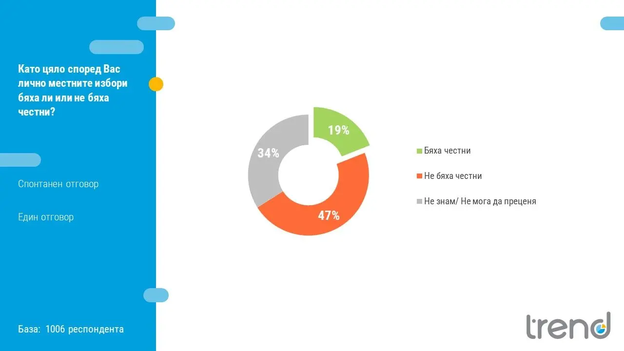 Оценката на отминалия местен вот показва високо недоверие към изборния процес. Близо половината (47%) от пълнолетните българи са на мнение, че вотът не е бил честен. Само 19% определят изминалите избори като честни, като този дял е по-висок сред електората на ПП-ДБ и ГЕРБ. Избирателите на ДПС са разделени по темата, докато мнозинството от гласуващите за БСП и Възраждане определят изборите като нечестни.