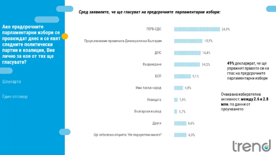6.9% от българите декларират, че ще се възползват от опцията „Не подкрепям никого“, а 49% са тези, които заявяват, че ще гласуват на предстоящите предсрочни парламентарни избори, което се равнява на около 2.6 до 2.8 милиона избиратели.
