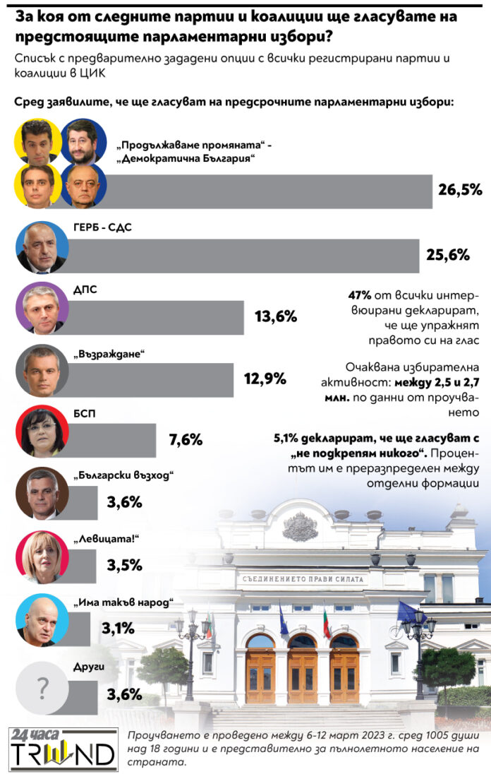 Пет формации със сигурно участие в следващото Народно събрание. Победителят остава неясен. Три партии остават под парламентарната бариера, но с подкрепа над 3%. Това показват данни от проучването на изследователски център “Тренд”, проведено по поръчка на “24 часа” между 6 и 12 март.